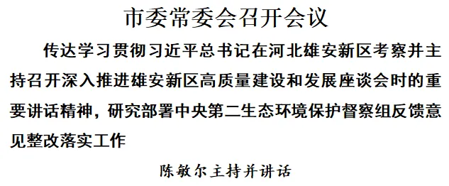 3月24日,市委常委会召开会议,传达学习贯彻习近平总书记在河北雄安新区考察并主持召开深入推进雄安新区高质量建设和发展座谈会时的重要讲话精神,研究部署中央第二生态环境保护督察组反馈意见整改落实工作。市委书记陈敏尔主持会议并讲话。